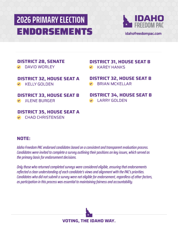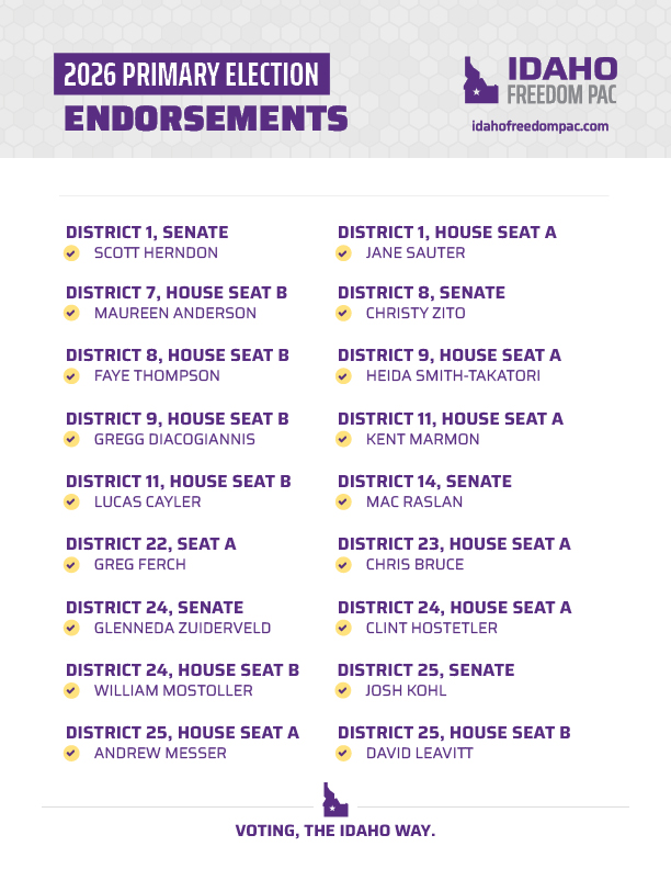 Today, we’re proud to announce Idaho Freedom PAC’s legislative endorsements for the 2026 Republican primary election for state legislature.